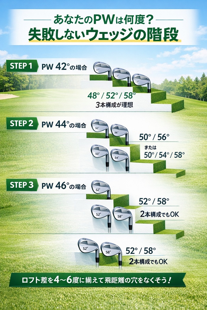 基本ルールはシンプルです。「PWのロフト角から4〜6度刻みで階段を作る」こと。