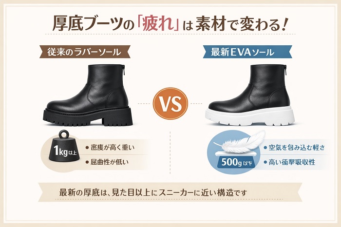 厚底ブーツに対して「修行のような重さ」というイメージを持っているなら、それは過去の素材選びが原因かもしれません。
