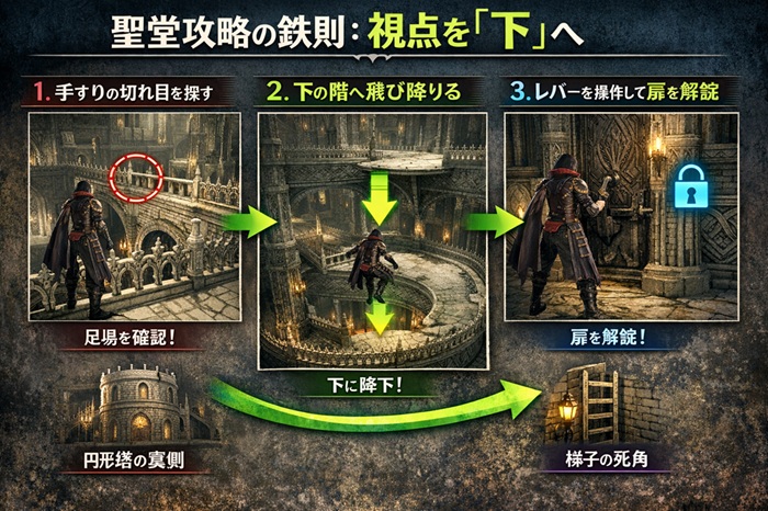 なぜなら、この聖堂のマップ設計は、プレイヤーの視線を水平方向に固定させるように作られており、足元のルートを見落としがちだからです。私も「道がない!」と叫んだ場所のすぐ横に、飛び降りるための隙間があった経験が何度もあります。