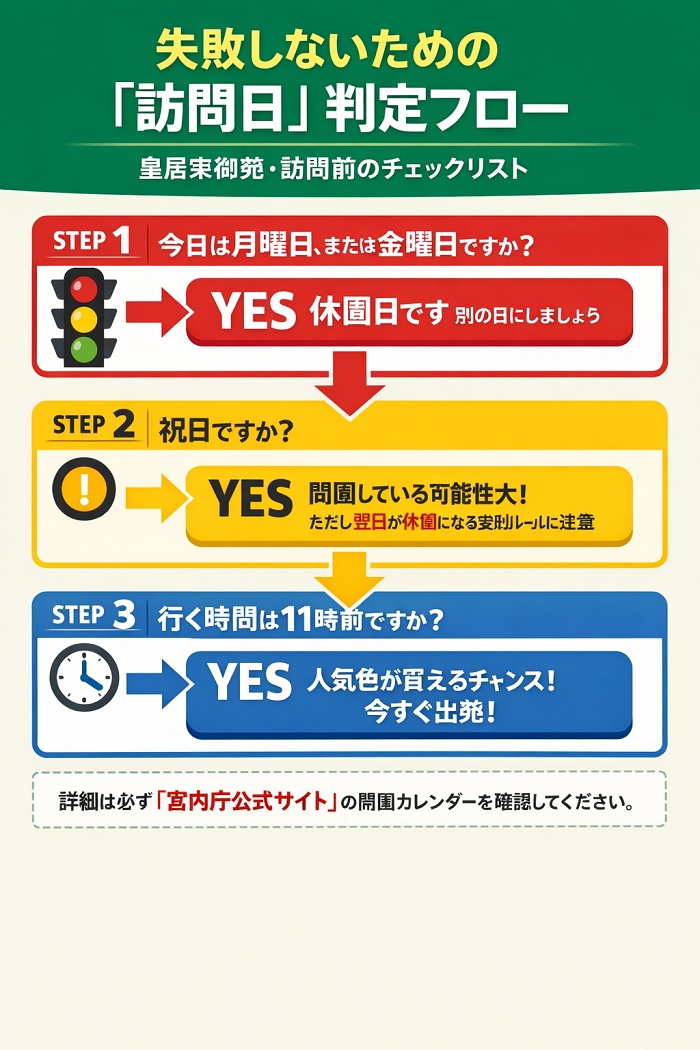 皇居財布を手に入れるための最大の壁は、在庫よりも先に「門が開いているかどうか」です。