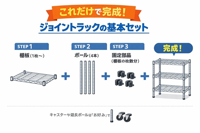 ダイソーの「ジョイントラック」は、「棚板」「ポール」「固定部品」という3つの基本パーツのルールさえ理解すれば、誰でも1,000円〜2,000円台でプロ級のシンデレラフィット収納を完成させられます。