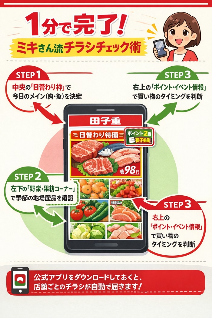 田子重のデジタルチラシと当日の献立決定は、最短で買い物を終えるためのセットメニューだと考えてください。