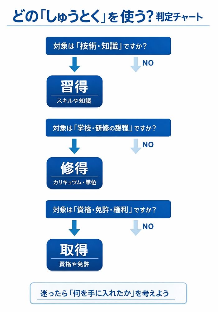 「身につける」と言い換えられるなら習得、「(課程を)終える」なら修得、「(資格を)取る」なら取得です。このシンプルな置き換えだけで、誤用の9割は防げます。