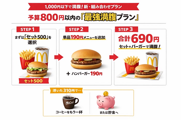 - セット500を主軸にする: 復活したマックポーク等の500円セットに単品を足すのが、新時代の賢い買い方です。