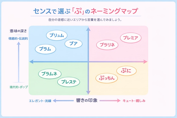 A. はい、アニコムの調査でも「食べ物シリーズ」は常に上位です。もし「被りたくない」というデザイナーらしいこだわりがあるなら、同じ「ぷ」でも「プリュム(羽)」や「プナ(泉)」のように、少し視点をずらした外来語を選ぶと、洗練された印象になります。