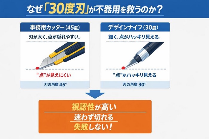 事務用カッターが通常45度〜60度なのに対し、切り絵に適したデザインナイフは「30度」という鋭い角度を持っています。