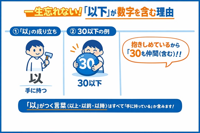 この語源をイメージしてみてください。「30(という数字)を手にギュッと持っている」のが「以下」の状態です。