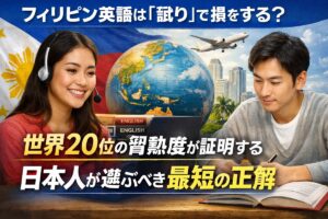 「フィリピン英語って、結局は訛っているんでしょ?」 「安かろう悪かろうで、変な癖がついたらどうしよう……」 英会話を始めようと検討している佐藤さんのような慎重な学習者ほど、このような不安を抱くのは当然のことです。 しかし、結論から申し上げましょう。 フィリピン英語は、アメリカの巨大企業が130万人以上の雇用を委託する「世界標準のビジネス英語」です。 「訛り」という表面的な言葉に惑わされて、世界で最 … 続きを読む フィリピン英語は「訛り」で損をする?世界20位の習熟度が証明する、日本人が選ぶべき最短の正解