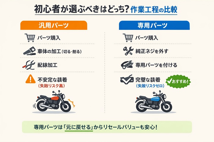 【結論】: 初めてのカスタムこそ、Amazonのノーブランド品ではなく「デイトナ」や「キジマ」といった国内有名ブランドの専用品を選んでください。