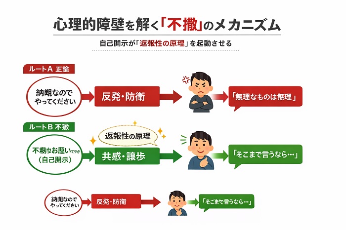 心理学的な観点から見ると、相手の反発心を中和し、協力を引き出すための「戦略的な自己開示」といえます。