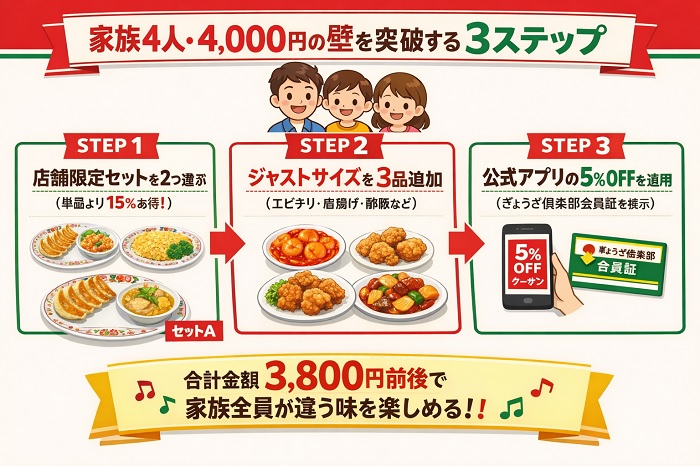 餃子の王将ヘビーユーザーであり、二児の父でもある私が、4,000円の壁を越えずに家族全員が満腹になる黄金の組み合わせを、あなたにこっそり伝授します。
