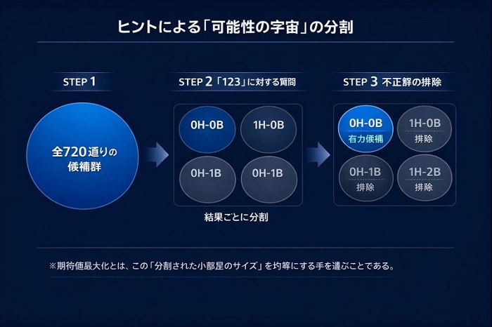 このゲームの本質は、正解を推測することではなく、「出されたヒント(H/B)を用いて、720通りの候補群をいかに効率よく切り刻み、死に体(矛盾する数字)を排除するか」という情報フィルタリングのプロセスにあります。