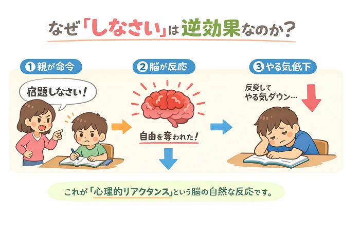 つまり、お母さんが「宿題をしなさい」と命令した瞬間、子供の脳内では「自分の自由が奪われた!」というアラートが鳴り、宿題そのものへの拒絶反応が生まれてしまうのです。