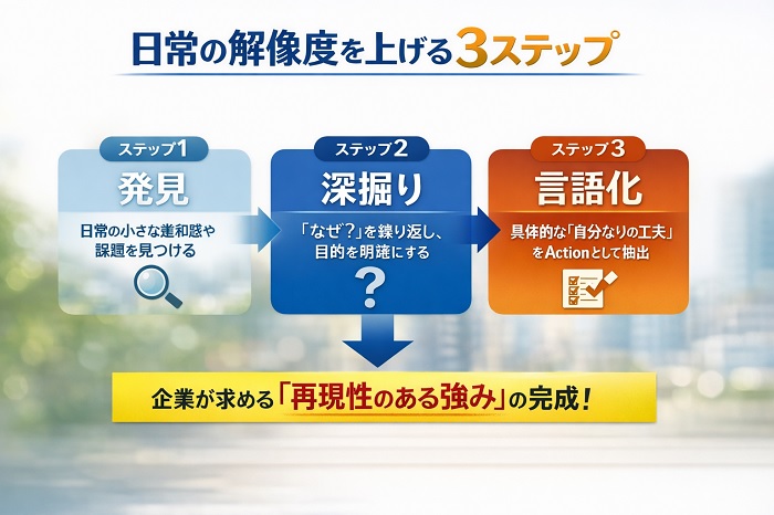 これを以下の3ステップで深掘りし、平凡な日常とビジネススキルの接点を見つけ出しましょう。