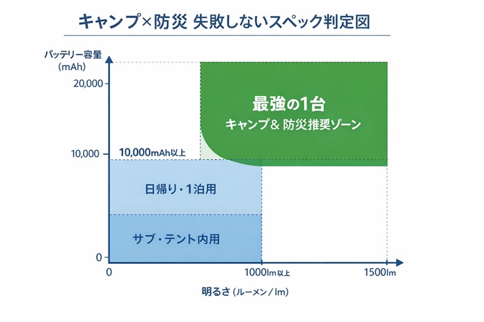 LEDランタン選びも同じです。私が提唱する、キャンプと防災を両立させるスペックの黄金比は「1000ルーメン × 10,000mAh」です。