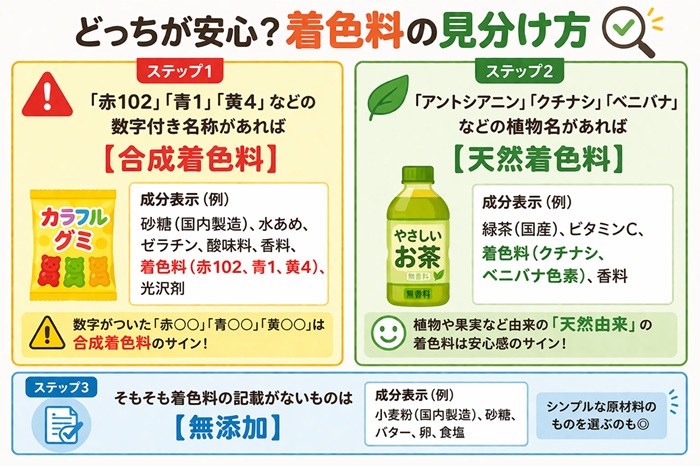 一方で、アントシアニンやクチナシといった「天然着色料」は、植物由来で安心感がありますが、色は少し落ち着いたトーンになります。