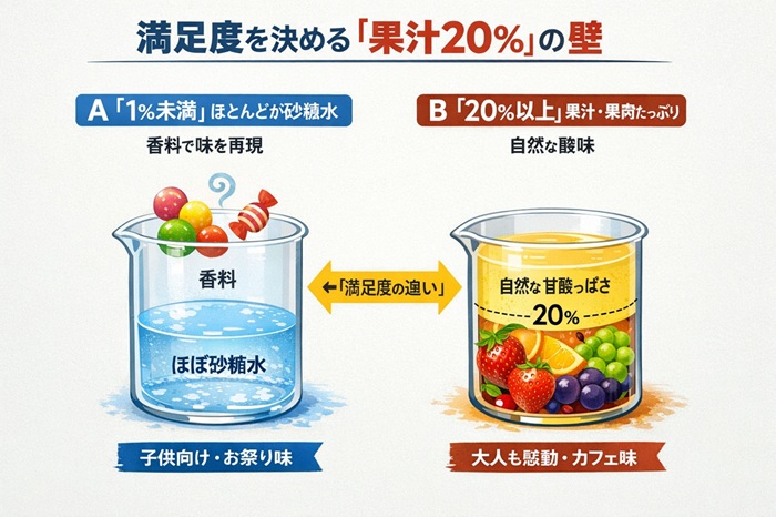 これに対し、大人が「本格的だ」と感じる境界線は、果汁含有量20%以上にあります。