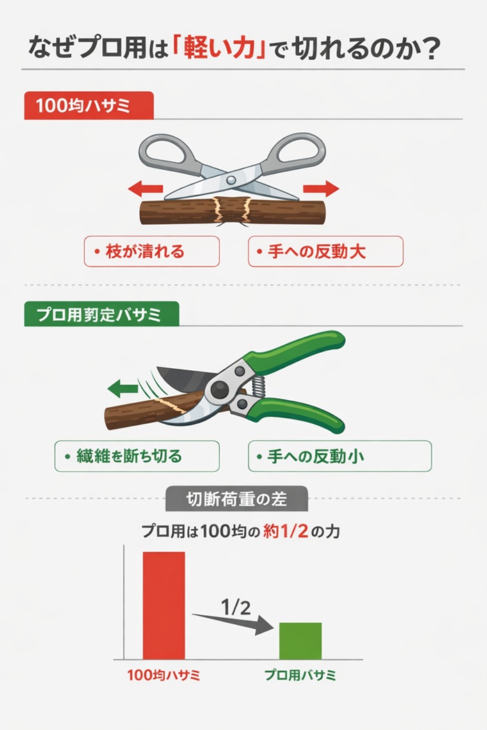 対して、プロ仕様の剪定バサミは、鋭い刃が枝に滑り込むように設計された「引き切り」の原理を応用しています。