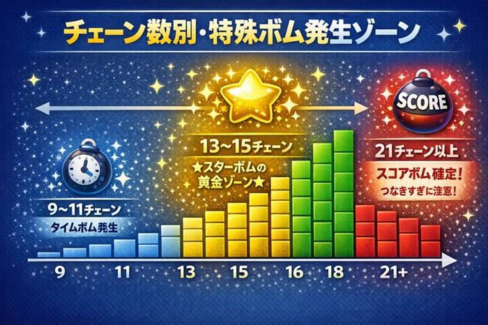 他の特殊ボムに邪魔されず、スターボムの確率を最大限に高められる「聖域」こそが、13チェーンなのです。