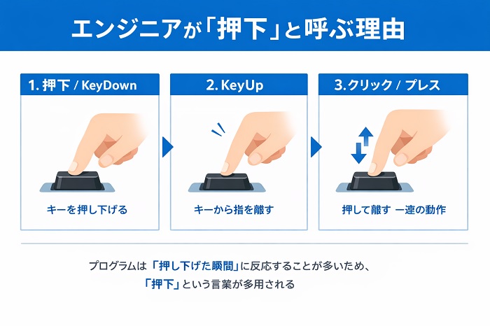 日常語の「押す」では、「指を離した瞬間(クリック完了)」までを含むのかが曖昧ですが、「押下」と表現することで「ボタンを押し下げる操作そのもの」を厳密に指定できるのです。