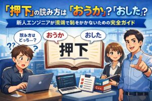 「佐藤さん、ここのログインボタンを押下(おうか)した時の挙動を確認しておいて」 先輩からそう指示された時、一瞬フリーズしてしまいませんでしたか? 「おうか……? 押すことだよな?」と頭をフル回転させながら、自分の知識が合っているのか不安になったはずです。 結論からお伝えします。 「押下」の正しい読み方は「おうか」です。 この記事では、新人教育担当として200名以上のエンジニアを育ててきた私が、辞書 … 続きを読む 押下の読み方は「おうか」?「おした」?新人エンジニアが現場で恥をかかないための完全ガイド