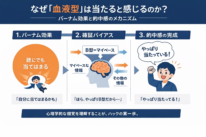 この確証バイアスが、血液型診断と個人の性格を結びつける「的中感」を強化し続けているのです。