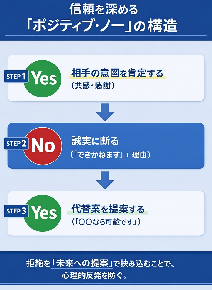 ポジティブ・ノーとは、単に「NO」を伝えるのではなく、「Yes(尊重)- No(事実)- Yes(提案)」という3段構成で伝える技術を指します。