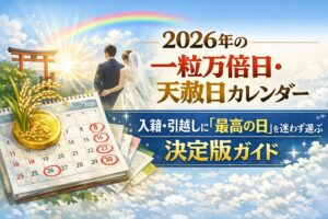 「2026年に結婚や引越しを控えているけれど、どの日が本当に良いのか分からない……」 「親から『せっかくなら縁起の良い日にしなさい』と言われたけれど、ネットで調べれば調べるほど、サイトによって言うことがバラバラで焦ってしまう」 今、そんな不安を抱えていませんか? 一生に一度の入籍や、新しい生活のスタートとなる引越し。 失敗したくないという思いが強いほど、情報の波に溺れてしまうものです。 こんにちは … 続きを読む 2026年の一粒万倍日・天赦日カレンダー|入籍・引越しに「最高の日」を迷わず選ぶ決定版ガイド