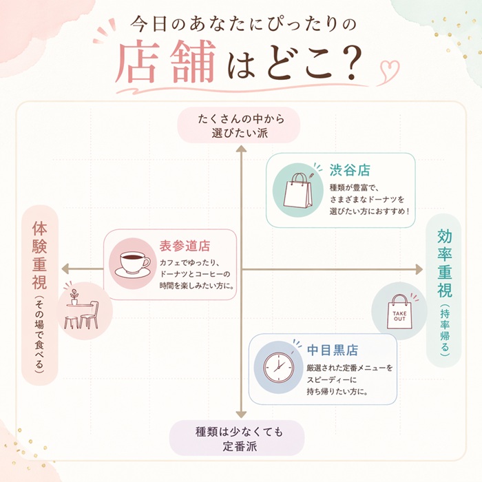 - 表参道店: 最大の特徴は2階のカフェスペース。「揚げたて提供」に力を入れており、その場で最高の鮮度を体験できます。友人と「美味しいね!」とその場で共有したいなら、ここ一択です。