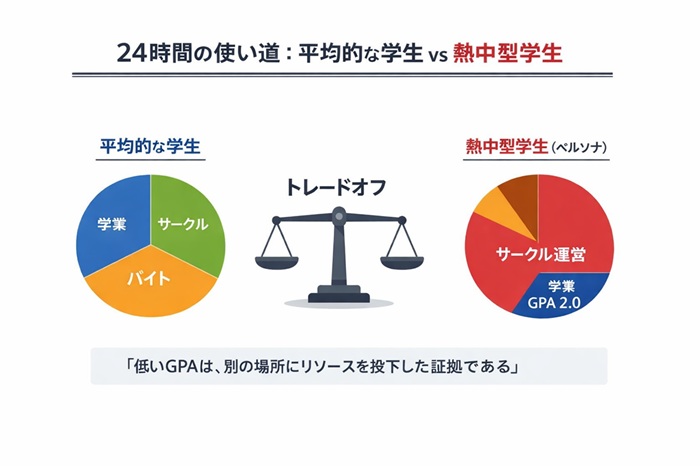 ここで重要なのは、学業成績とガクチカ(学生時代に力を入れたこと)は、時間という有限な資源を奪い合う「トレードオフ」の関係にあるという事実です。