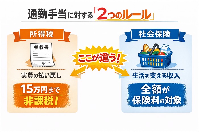この混乱の原因は、所得税と社会保険料では「通勤手当」に対する考え方が根本的に異なる点にあります。