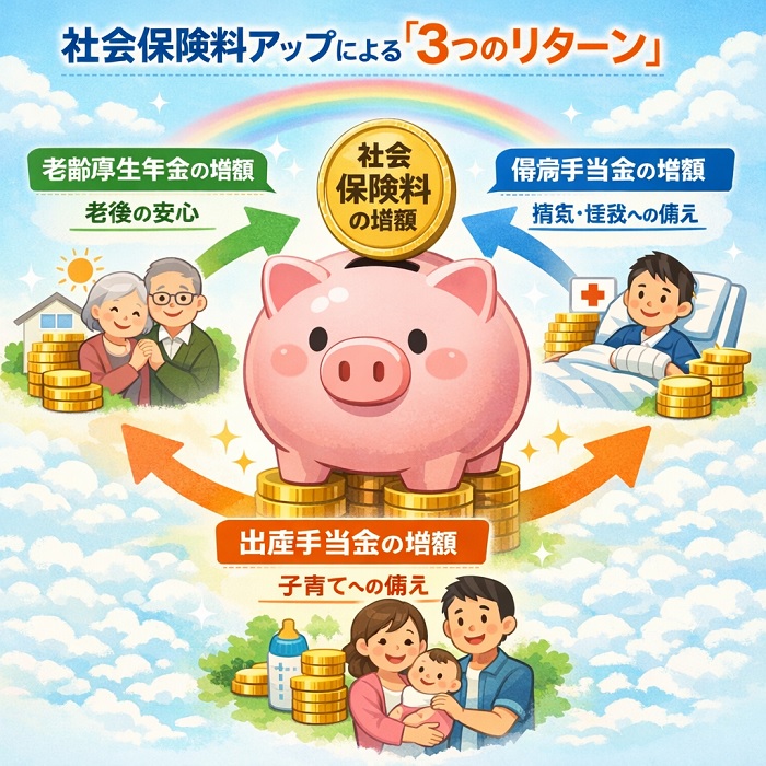 社会保険制度の仕組み上、保険料の負担増は「将来の年金額」や「万が一の休業補償」を手厚くする「積立」の側面を持っています。