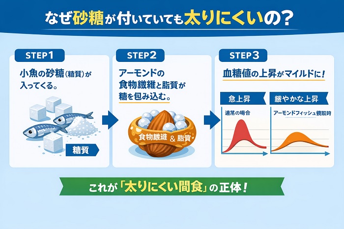 しかし、アーモンドに含まれる「良質な脂質」と「食物繊維」が、小魚の糖質による血糖値の急上昇を劇的に緩やかにしてくれます。