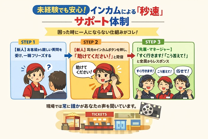 なぜなら、映画館には個人のセンスに頼らず、チームとマニュアルで未経験者を支える完璧な仕組みが整っているからです。