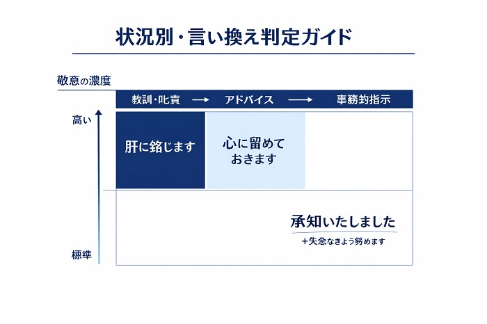 - 「心に留める」で受容を示す: アドバイスを大切に受け止める、柔らかく知的な表現。