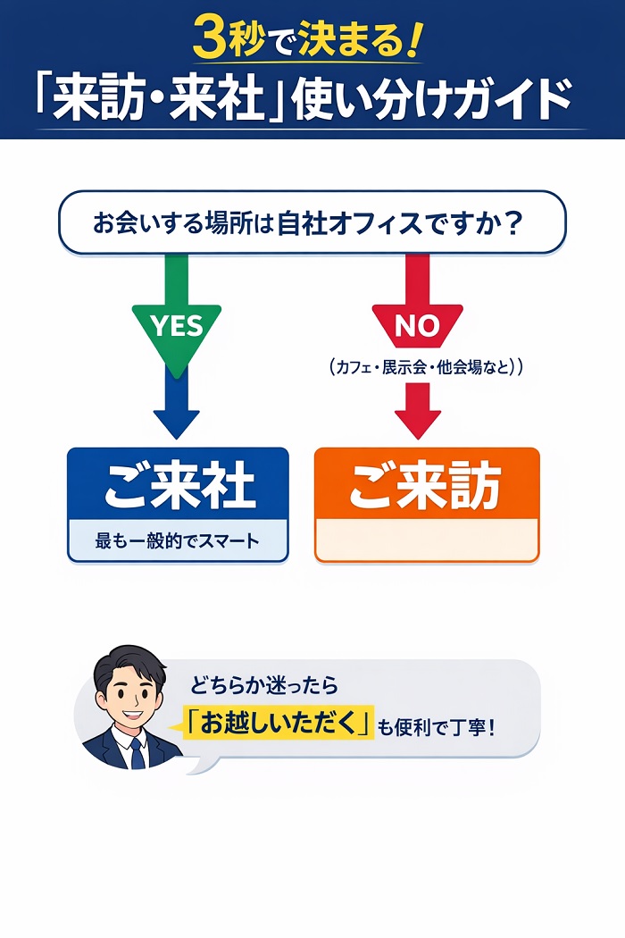 【3秒判定】オフィスなら「来社」、社外なら「来訪」。状況別の最適ワード
