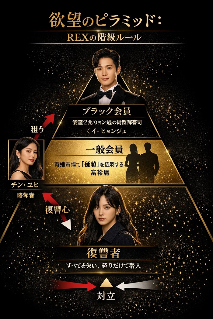 資産、職業、家柄によって会員が厳格にランク付けされ、最上位の「ブラック」会員を巡って、欲望にまみれた男女が戦略的な心理戦を繰り広げます。