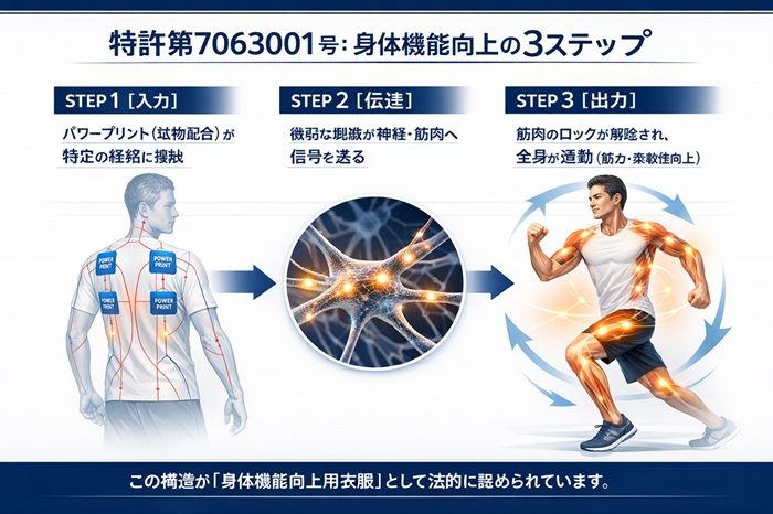 リライブシャツが「嘘」ではない最大の証明は、日本国特許庁に認められた「特許第7063001号(身体機能向上用衣服)」の存在です。