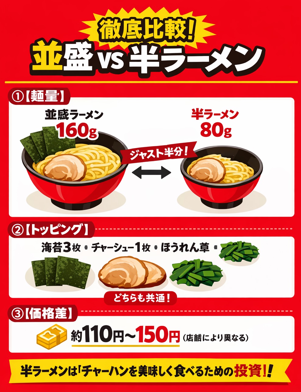 | 項目 | 並盛セット(従来型) | 半ラー+チャーハン(戦略型) |