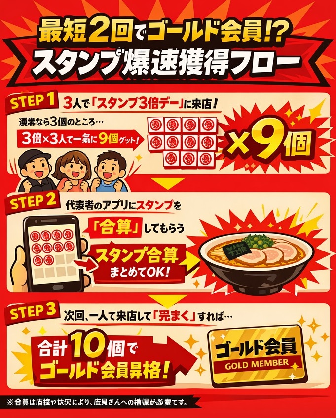なぜなら、この「合算ルール」を知っているかどうかで、ゴールド会員(トッピング永久無料)までのコストが3分の1以下に抑えられるからです。私はかつて一人でコツコツ貯めていましたが、この裏技を知ってからは、後輩を連れて行くことで一気にスタンプを稼ぐ「戦略的完まく」に切り替えました。