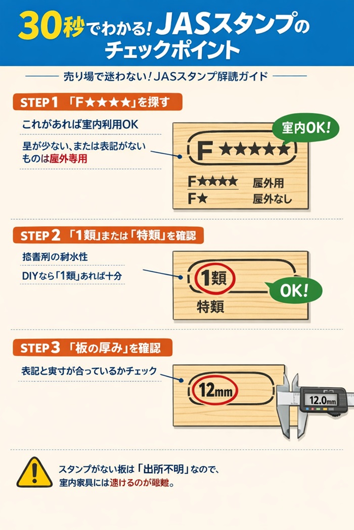 この記事では、プロの視点から、売り場で30秒あれば正解が出せる「JASスタンプの読み方」と、あなたの用途に最適な板の選び方を徹底解説します。