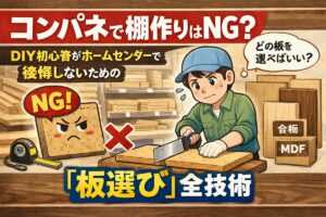 ホームセンターの資材売り場で、1枚1,500円ほどで売られている「コンパネ」を前に、「これで十分じゃないか?」「安いし、丈夫そうだし……」とスマホを片手に悩んでいませんか? 結論からお伝えします。コンパネはDIYに使えますが、何も知らずに選ぶと「部屋が薬品臭くなる」「ペンキが剥がれる」といった最悪の後悔を招くリスクがあります。 私はこれまで1,000人以上の初心者にDIYを指導してきましたが、資材 … 続きを読む コンパネで棚作りはNG?DIY初心者がホームセンターで後悔しないための「板選び」全技術