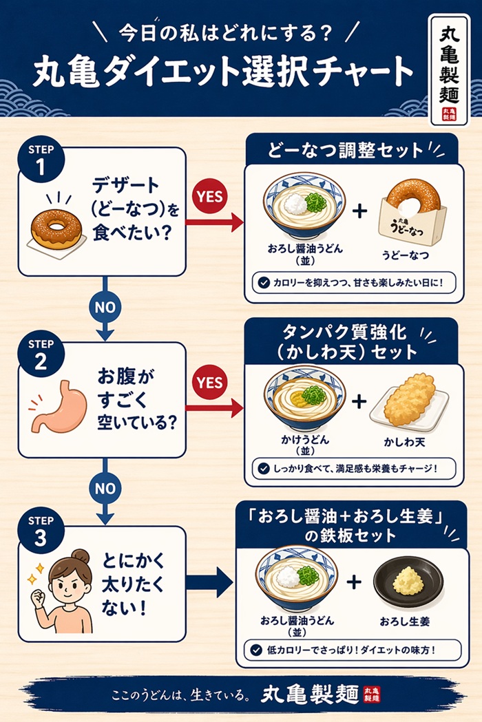 - 解説: 「丸亀うどーなつ」は非常に高カロリーなため、うどんと天ぷら、さらにどーなつを一人で完食すると1,000kcalを超えます。「うどん+どーなつシェア」を1つのセットと考えましょう。