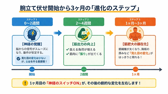 なぜなら、トレーニング開始後の最初の2週間〜1ヶ月に起こる変化は、筋肉のサイズアップではなく「神経系適応」だからです。