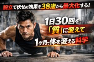 「最近、お腹周りが急に気になり始めた」 「健康診断の結果を見て、このままではいけないと焦っている」……。 IT企業でデスクワークに励む38歳の佐藤健一さんのようなビジネスマンにとって、自宅で手軽に始められる「腕立て伏せ」は、体型改善の第一歩として最適な選択です。 しかし、結論からお伝えします。 「とりあえず毎日30回」という根性任せのトレーニングは、30代後半の初心者にとって、最も効率が悪く、怪我 … 続きを読む 腕立て伏せの効果を38歳から最大化する!1日30回を「質」に変えて1ヶ月で体を変える科学