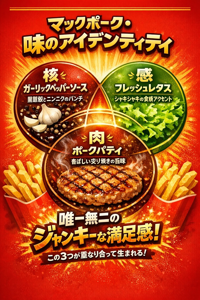エグチやチキチーが「万人受けするマイルドさ」を特徴とするのに対し、マックポークは「ガーリックとペッパーによる攻撃的な旨味」に特化しています。