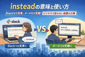 「代わりに〜と言いたいけれど、insteadを英文のどこに入れればいいのか確信が持てない」 と、送信ボタンを押す前に手が止まってしまうことはありませんか? IT企業のプロジェクトマネージャーとして海外チームとやり取りをする方のようなビジネスパーソンにとって、英語の「語順」は常に悩みの種です。 結論からお伝えしましょう。 ビジネスチャット(Slack等)なら「文末」、フォーマルなメールなら「文頭」に … 続きを読む insteadの意味と使い方|Slackなら文末、メールなら文頭?ビジネスで迷わない配置の正解