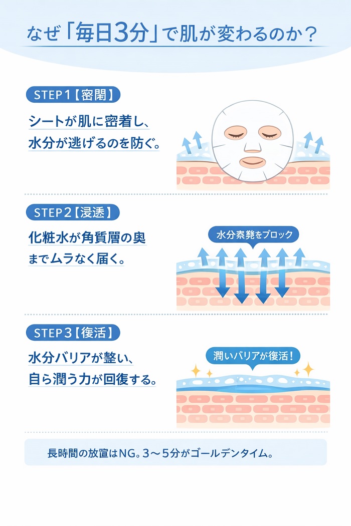 シートで密閉することで、手で化粧水をつけるよりもムラなく、効率的に水分を肌の隅々(角質層)まで届けることができるからです。