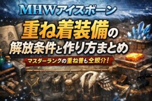 「性能はそのままで、見た目だけを変えたい!」 モンスターハンターワールド:アイスボーン(MHWI)の醍醐味といえば、強力な装備を揃えるだけでなく、自分好みの見た目にカスタマイズできる「重ね着装備」ですよね。 本記事では、アイスボーンにおける重ね着装備の解放条件から、マスターランク装備の重ね着化、必要な素材の入手方法までを詳しく解説します。 お気に入りの装備でハンターライフをより楽しみましょう! 目 … 続きを読む 【MHWアイスボーン】重ね着装備の解放条件と作り方まとめ|マスターランクの重ね着も全紹介!
