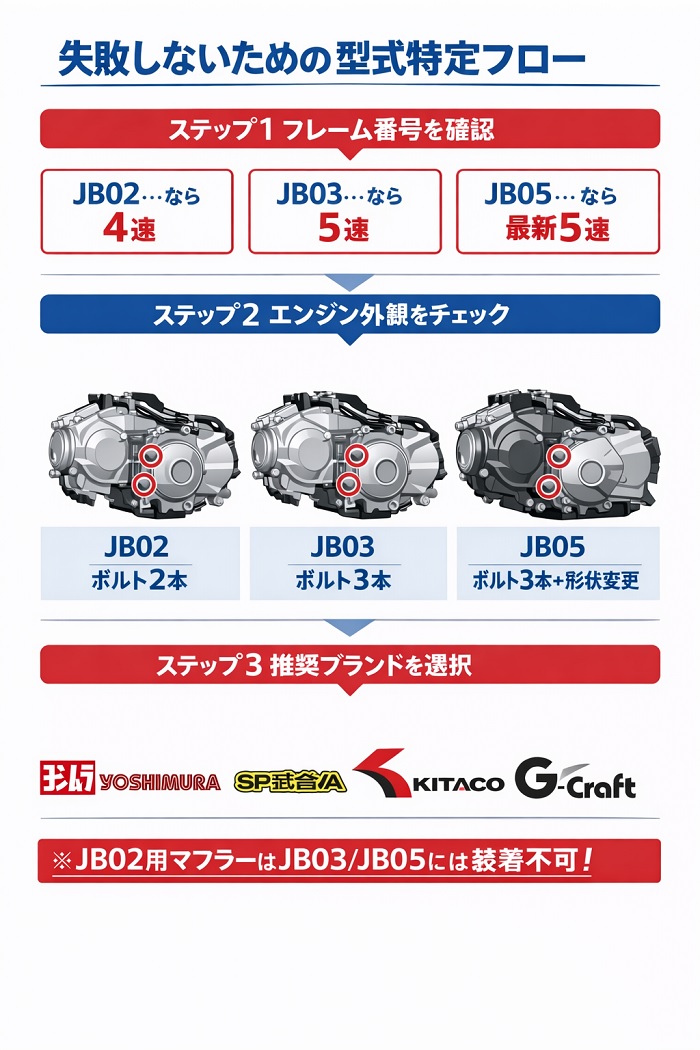 【結論】: パーツをポチる前に、必ず車検証かフレームのネック部分にある「型式(JB02/JB03/JB05)」を確認してください。